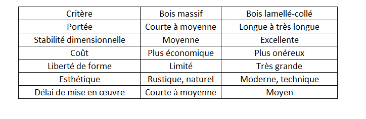 Le choix entre bois massif et lamellé-collé dépend de plusieurs critères : portée, esthétique, budget, usage du bâtiment, contraintes de chantier, etc.